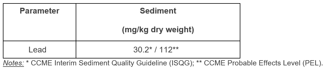 Canadian marine sediment quality guidelines for lead are available (Table 1); however, these guidelines are derived from toxicity endpoints in benthic invertebrates and, therefore, are not protective of birds and marine mammals.