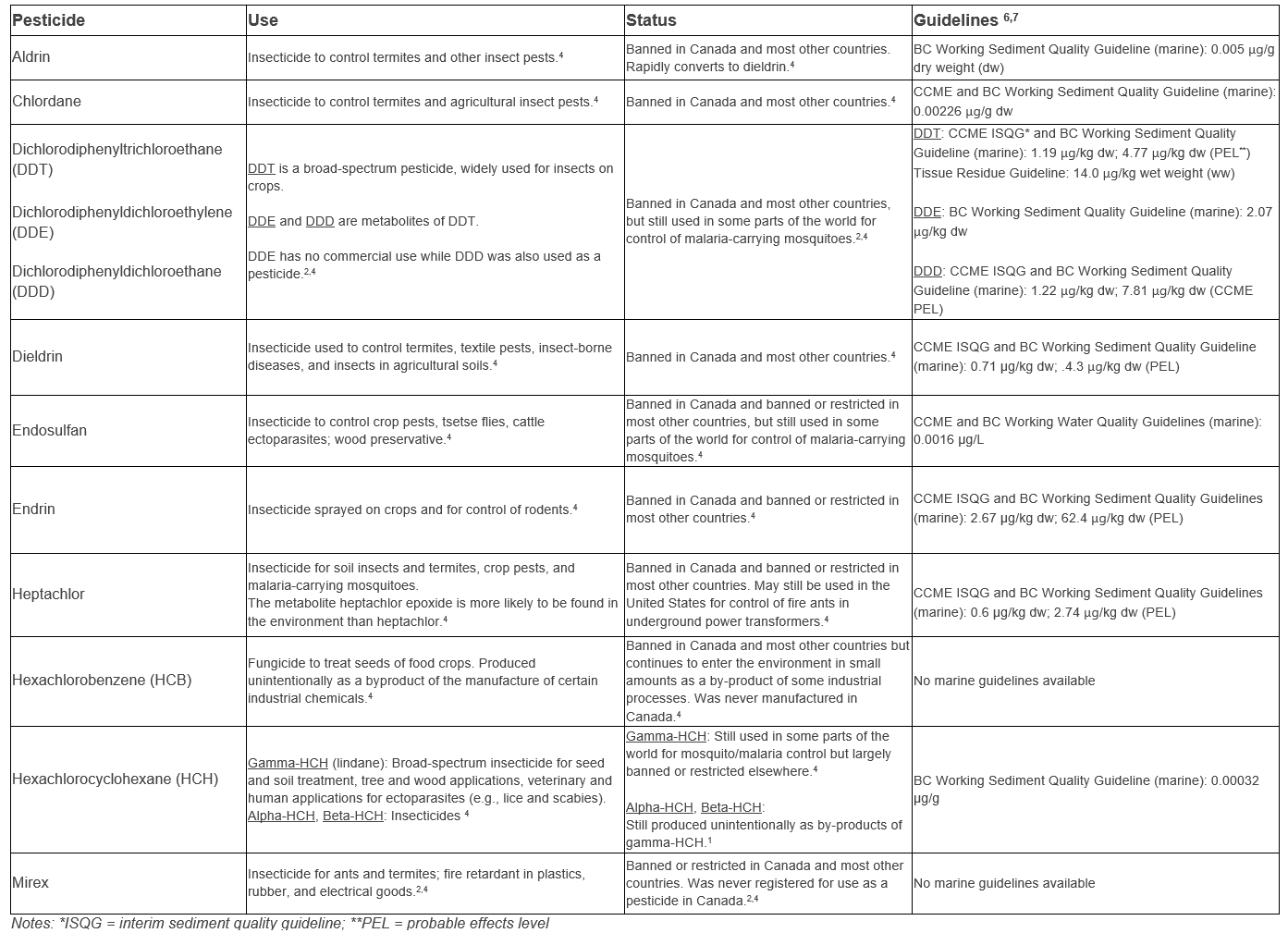 Canadian federal 7 and provincial 6 marine sediment quality guidelines protective of marine invertebrates are available for several OCPs (Table 1). However, tissue residue guidelines for the protection of wildlife consumers of aquatic biota are only available for DDT.