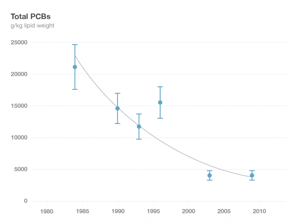 Despite their persistence, PCB concentrations have been declining in environmental media since regulations were put in place. For example, concentrations measured in blubber biopsies from free ranging harbour seal pups in Puget Sound, Washington declined by 81% between 1984 and 2003.5