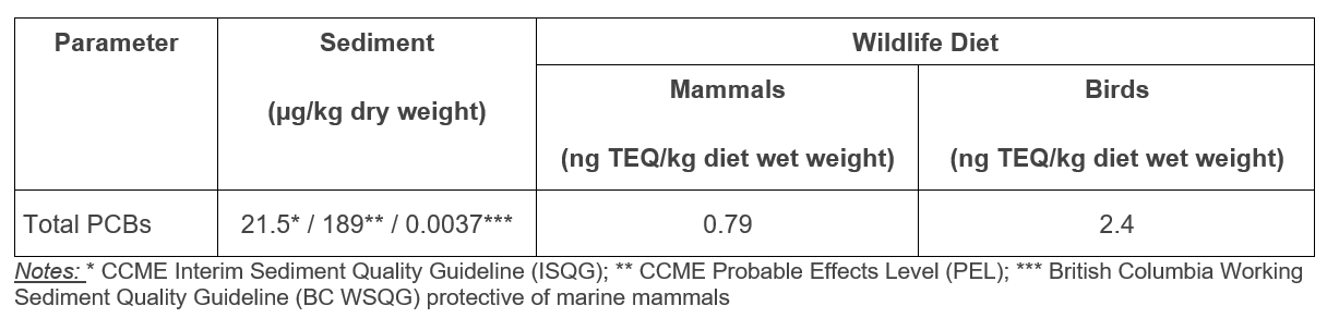 It is important to note that most sediment guidelines are largely based on toxicity endpoints for invertebrates and, therefore, are not necessarily relevant to organisms higher up in the food web, such as marine mammals. Regulatory guidelines protective of marine mammals are not yet available for most contaminants but are currently under development in Canada for certain priority chemicals, including PCBs. A Working Sediment Quality Guideline protective of marine mammals was recently adopted by British Columbia (BC), based on the work of Alava et al. (2012) (Table 1).10,11