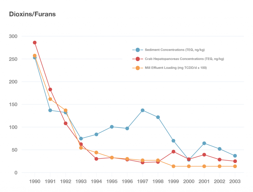 In British Columbia (BC), pulp and paper mills historically released large amounts of dioxins and furans into the marine environment. Wood treatment by chlorophenol-based chemicals was also a major source of dioxins and furans to the marine environment; however, the use of these products has declined.