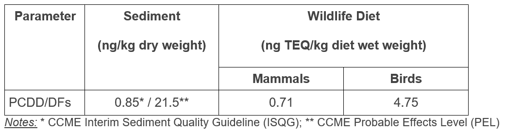 Canadian Sediment Quality Guidelines protective of marine aquatic life are available for PCDD/DFs, and these guidelines have been adopted in British Columbia (Table 1).